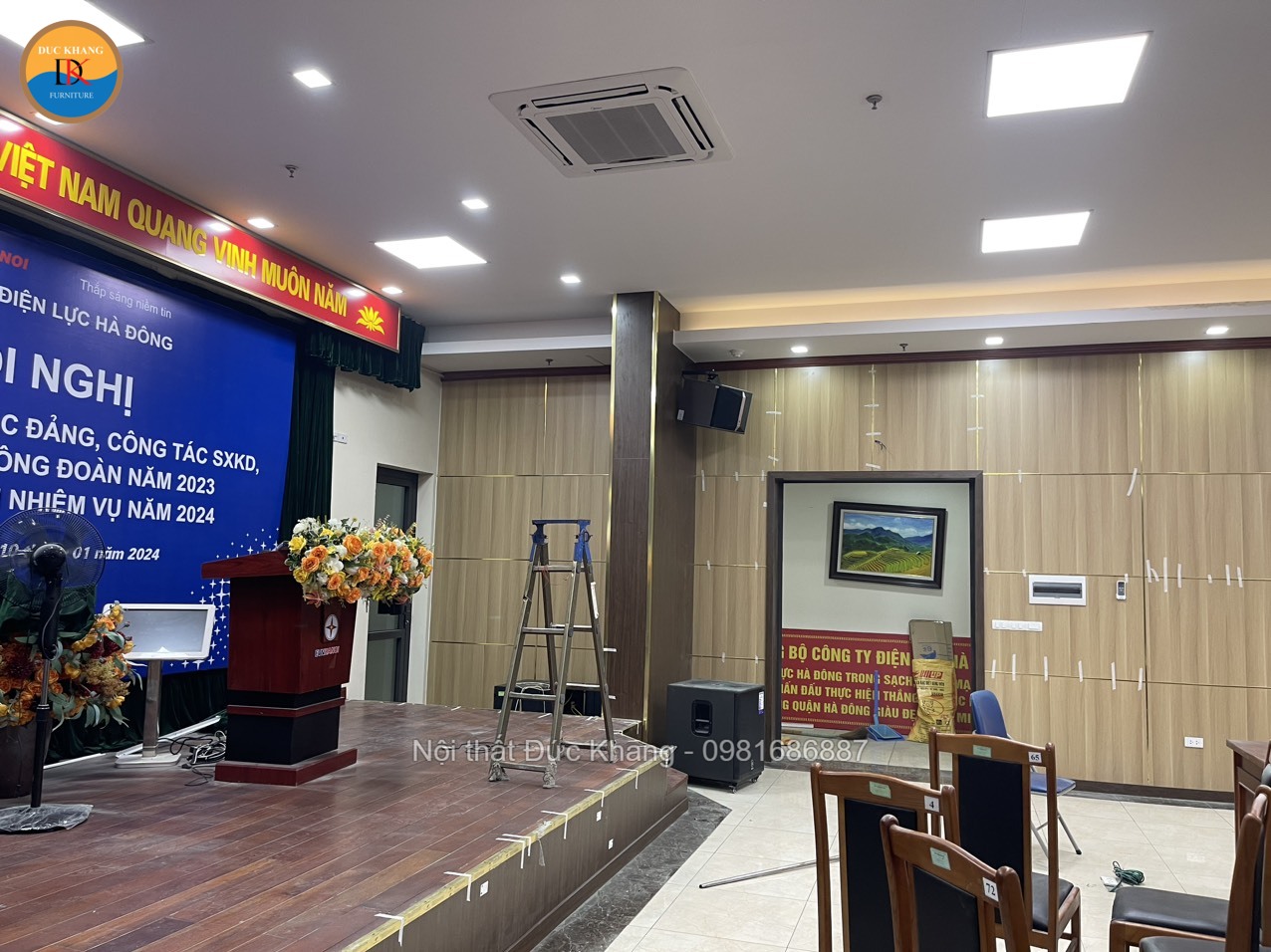 Hội trường là không gian rộng lớn, được sử dụng cho các mục đích tổ chức sự kiện, hội nghị, các công việc mang tính tập thể,… Chính vì thế, cần thiết kế nội thất hội trường đảm bảo linh hoạt, đầy đủ công năng sử dụng, đẹp mắt. Dưới đây là một số hình ảnh về dự án thi công nội thất hội tường tại công ty Điện lực Hà Đông của Đức Khang.