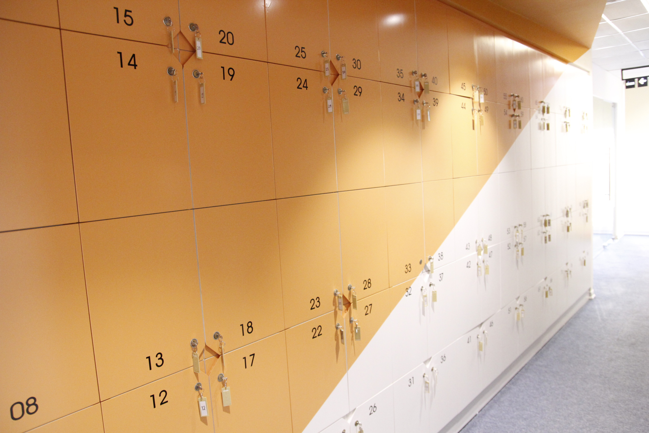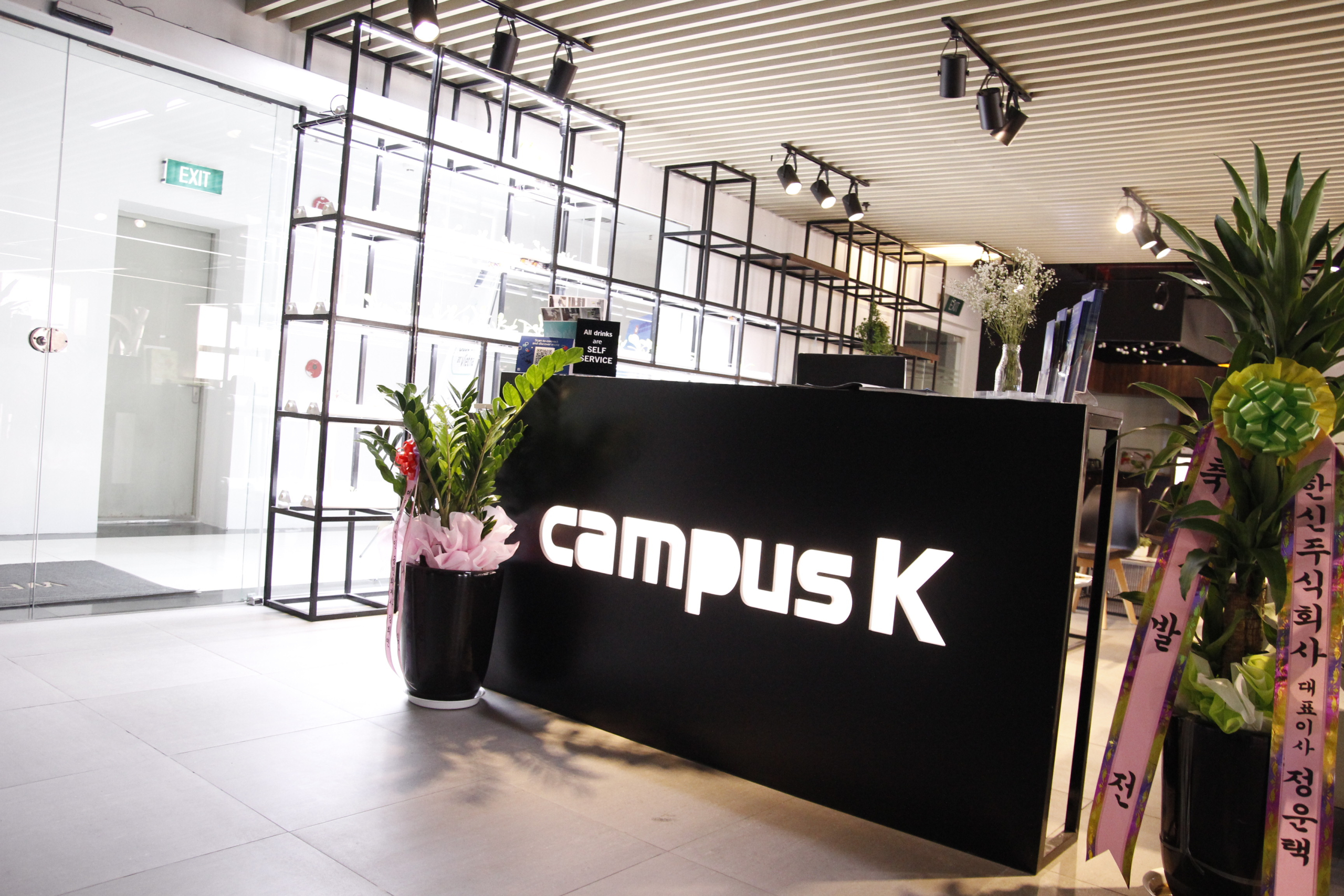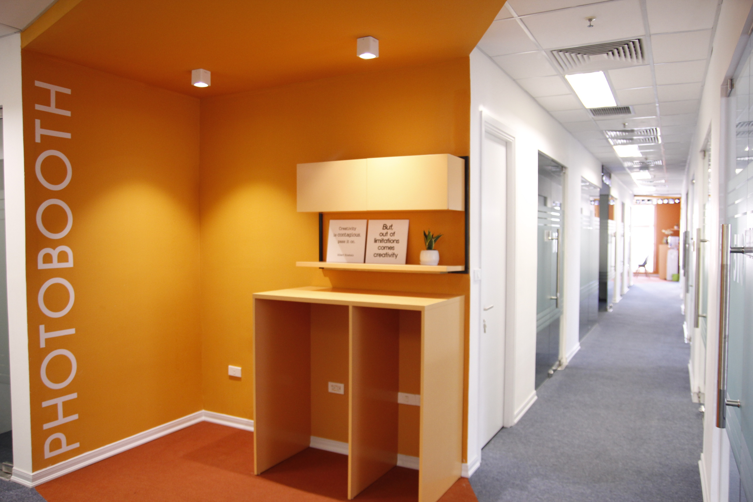 Do là văn phòng làm việc chung nên những tiện ích chung như máy in, tủ đồ sẽ được sử dụng chung. Vì vậy mà những vị trí này được đặt tại vị trí dễ quan sát và thuận tiện cho người dùng dễ nhìn thấy. Khu vực đặt máy in của văn phòng Campus K được sơn nổi bật với màu cam đặt tại lối đi.
