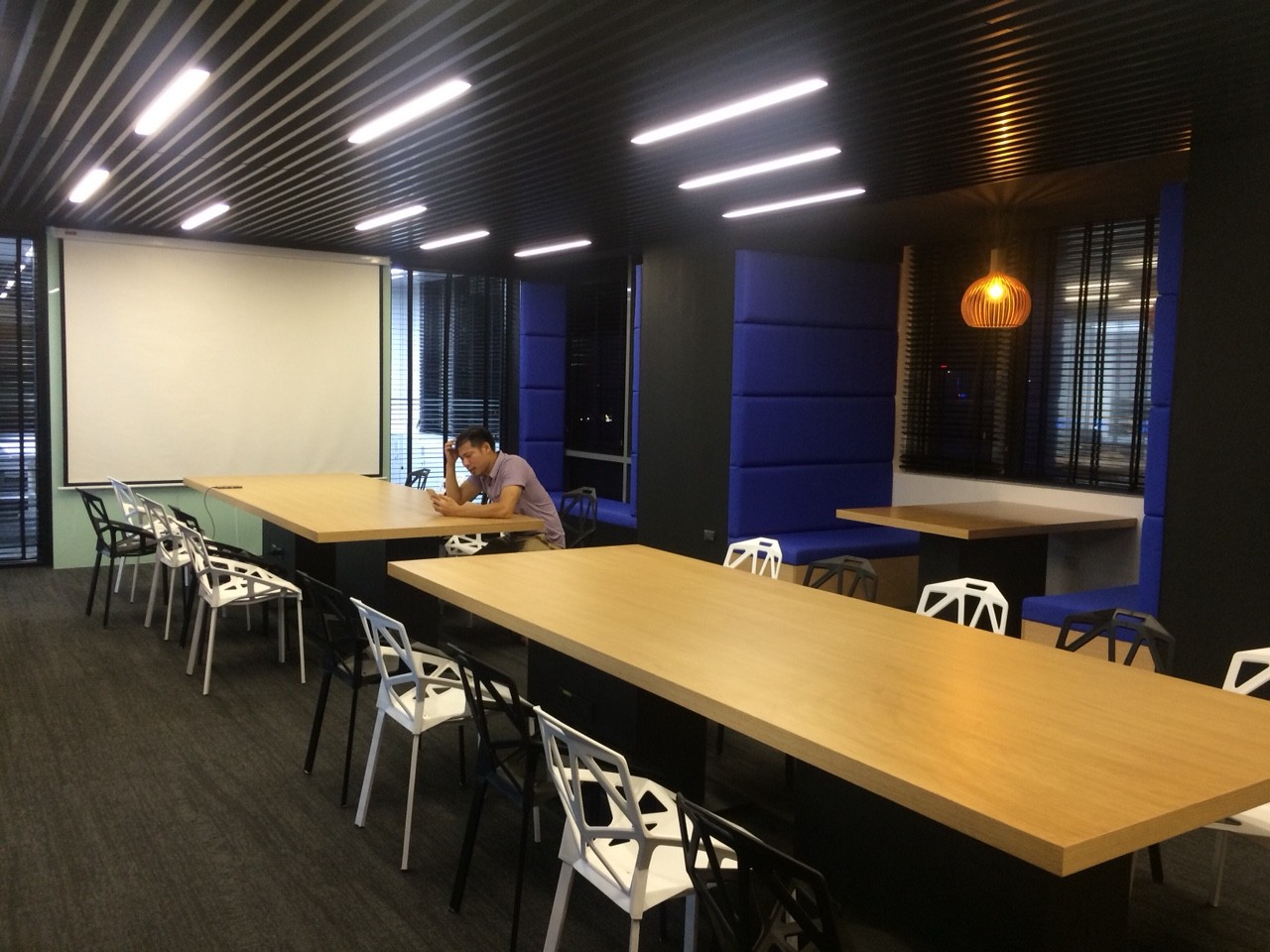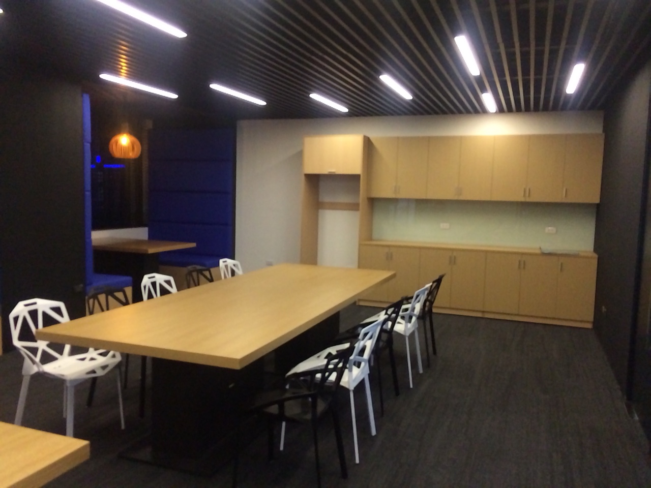 Phòng họp của HD Mon được đặt ở nơi gần khu vực làm việc để thuận tiện cho việc di chuyển của tất cả các nhân viên. Vị trí này cũng được tận dụng tối đa ánh sáng tự nhiên. Ánh sáng tự nhiên sẽ giúp cân bằng tâm trạng, điều hòa không khí phòng họp giúp các cuộc hội họp diễn ra một cách suôn sẻ và không quá áp lực. Bàn họp kiểu mặt gỗ chân sắt đơn giản, bền bỉ và tối đa chi phí. Ghế họp là loại ghế chân xoay tiện dụng, khung inox chắc chắn.