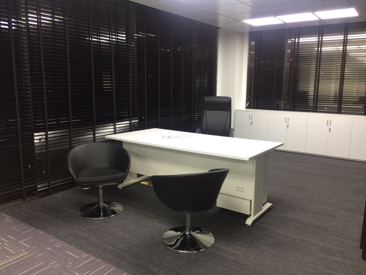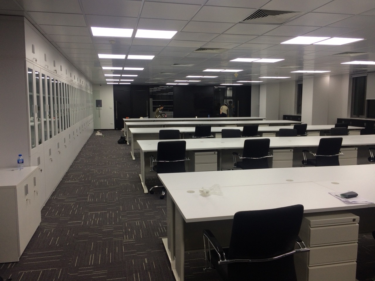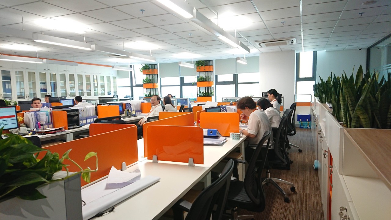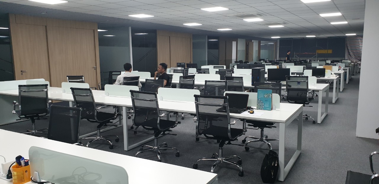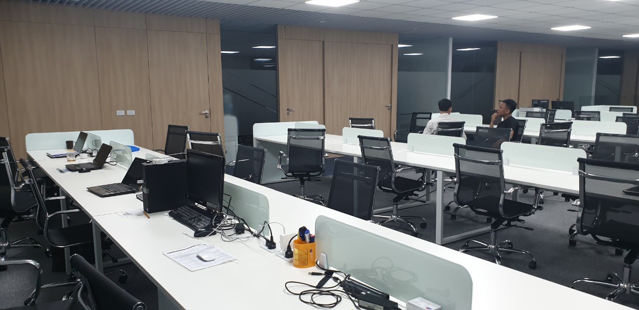 Trong khu làm việc này sử dụng hệ bàn chân sắt có kèm tủ tài liệu di động bên dưới. Hệ bàn module giúp tiết kiệm diện tích rất nhiều, mặt bàn có lỗ khoát để đi đường dây điện. Các bàn được ngăn cách với nhau bằng tấm kính lửng mặt bàn để tạo sự riêng tư. Một hệ tủ tài liệu dài để lưu trữ giấy tờ và tài liệu cho công ty. Ghế ngồi là loại ghế chân xoay êm ái có đệm lưới thoáng mát.