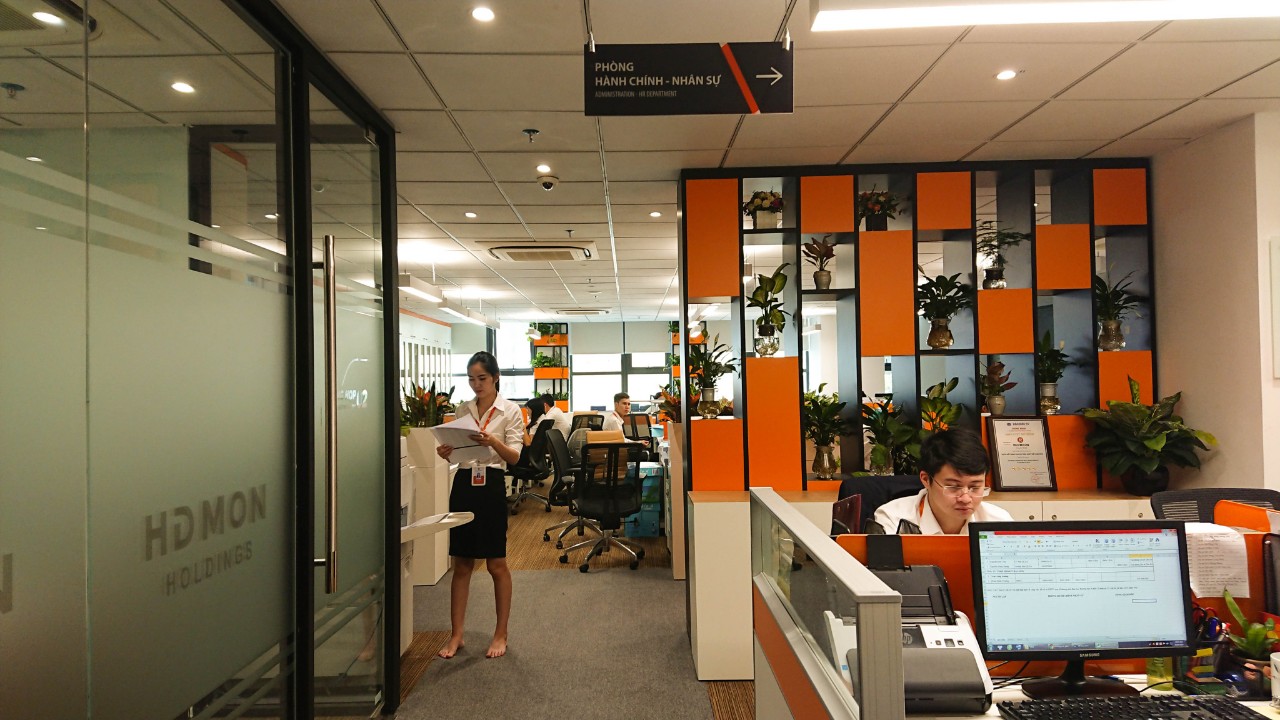 Bên cạnh khu làm việc có màu sắc chủ đạo là trắng và đen thì văn phòng HD Mon còn có một khu nữa với màu sắc trắng và cam chủ đạo. Khu vực này thì có cách bài trí rực rỡ hơn với nhiều màu sắc hơn. Khu vực này có nhiều ánh sáng tự nhiên và được bài trí thêm nhiều cây xanh, tạo không gian thoáng mát và rất dễ chịu.